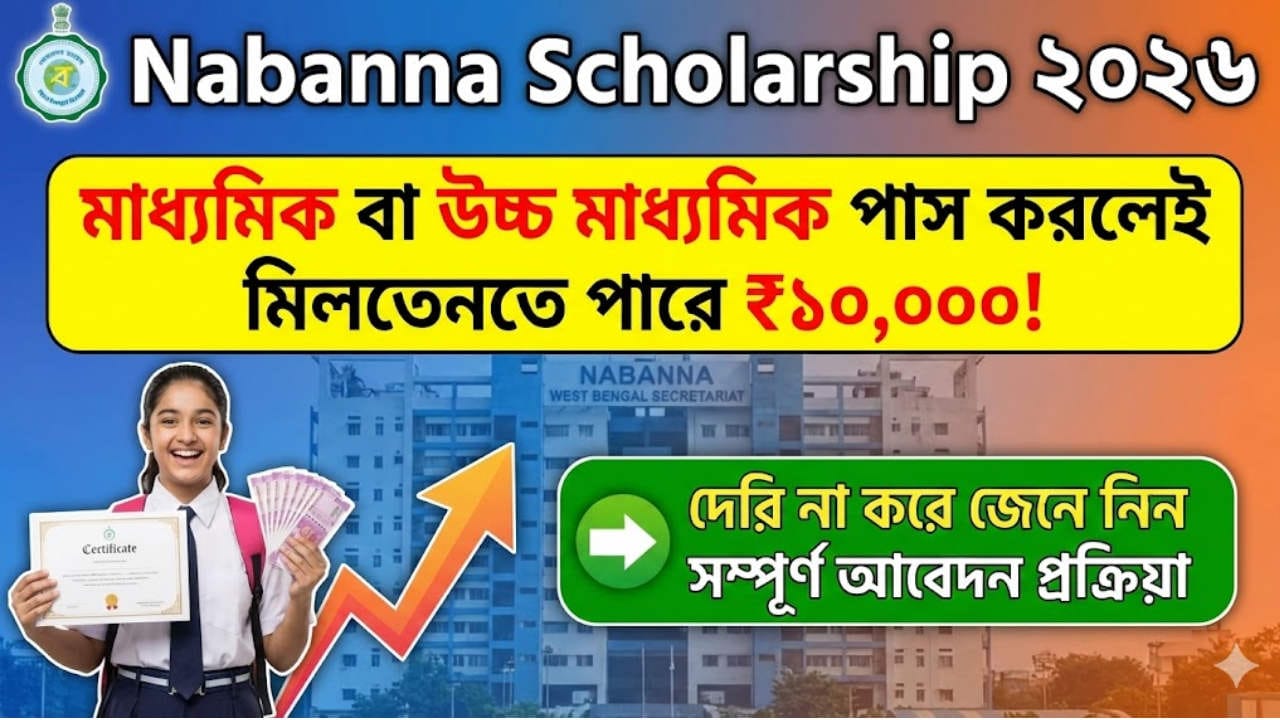 নবান্ন স্কলারশিপ ২০২৬ পশ্চিমবঙ্গের অসচ্ছল অথচ মেধাবী ছাত্রছাত্রীদের জন্য এক বড় সুযোগ। মাধ্যমিক বা উচ্চমাধ্যমিকের পর উচ্চশিক্ষায় ভর্তি হয়েছেন অথচ অর্থের চিন্তায় ভুগছেন—তাহলে দেরি না করে আবেদন করুন। সঠিক সময়ে সঠিক পদক্ষেপই ভবিষ্যতের পথ তৈরি করে।