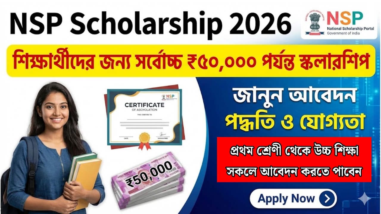NSP Scholarship 2026 শিক্ষার্থীদের জন্য একটি গুরুত্বপূর্ণ আর্থিক সহায়তা প্রকল্প। সর্বোচ্চ ₹৫০,০০০ পর্যন্ত স্কলারশিপের সুযোগ, স্বচ্ছ ডিজিটাল আবেদন ব্যবস্থা এবং সরাসরি ব্যাংক ট্রান্সফারের সুবিধা—সব মিলিয়ে এটি উচ্চশিক্ষায় এগিয়ে যাওয়ার বড় সহায়ক হতে পারে।